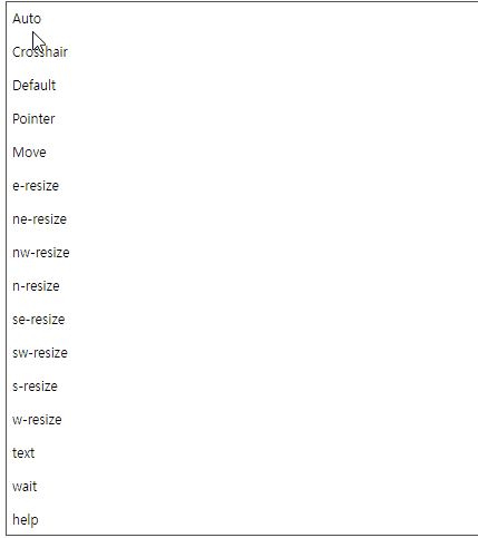 더보기<p style="cursor:auto">Auto</p> <p style="cursor:crosshair">Crosshair</p> <p style="cursor:default">Default</p> <p style="cursor:pointer">Pointer</p> <p style="cursor:move">Move</p> <p style="cursor:e-resize">e-resize</p> <p style="cursor:ne-resize">ne-resize</p> <p style="cursor:nw-resize">nw-resize</p> <p style="cursor:n-resize">n-resize</p> <p style="cursor:se-resize">se-resize</p> <p style="cursor:sw-resize">sw-resize</p> <p style="cursor:s-resize">s-resize</p> <p style="cursor:w-resize">w-resize</p> <p style="cursor:text">text</p> <p style="cursor:wait">wait</p> <p style="cursor:help">help</p>