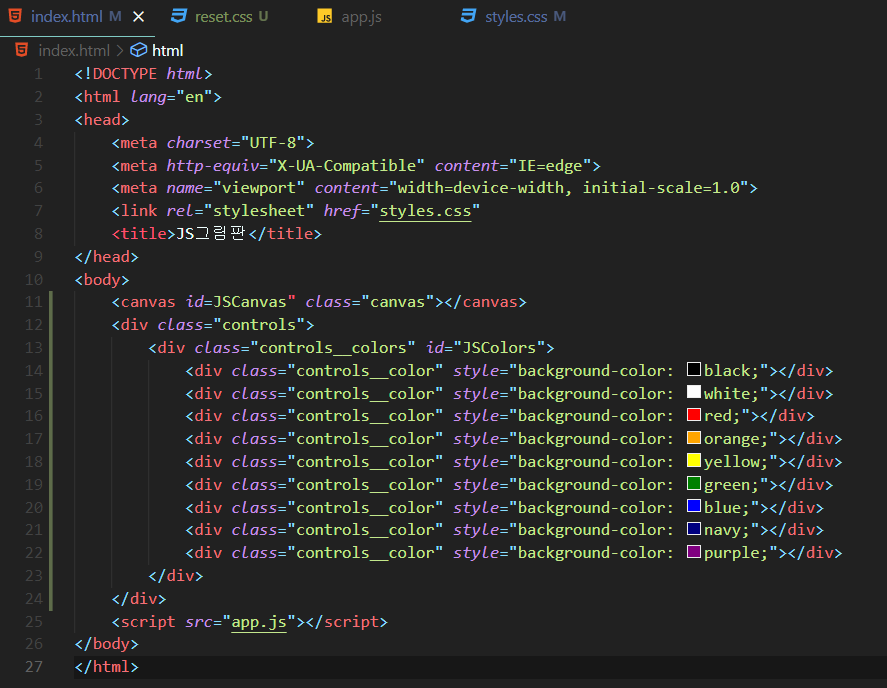 index.html에서 <body>부분에 <canvas> 만들어줍니다. (id, class원하는대로)